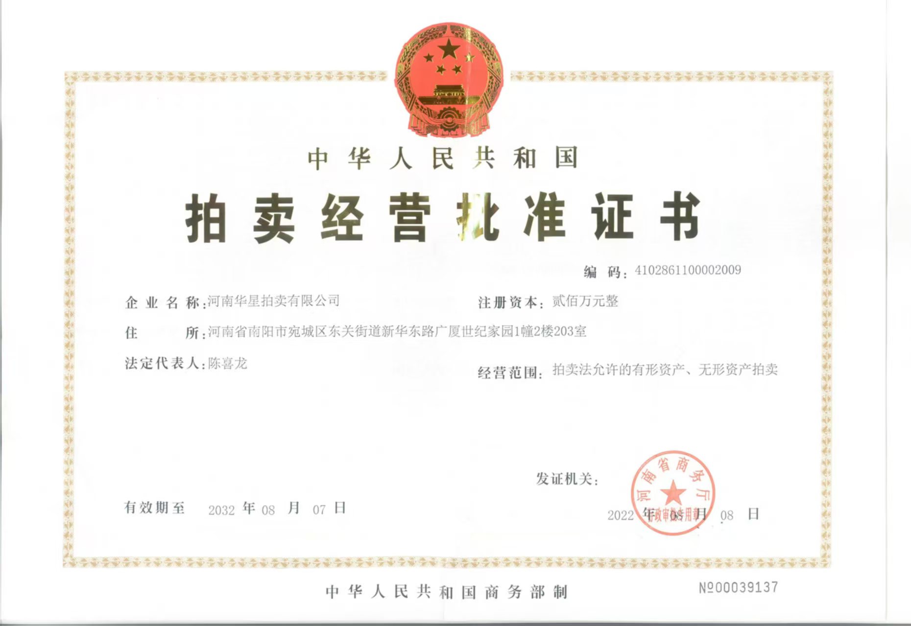 拍賣經(jīng)營批準證書 |